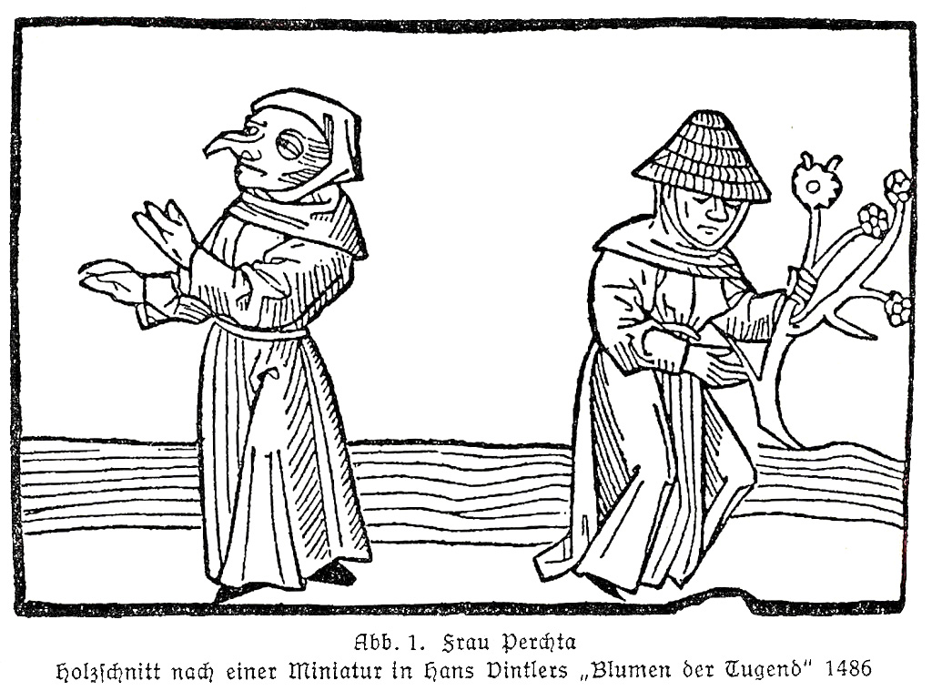 In einem um 1393 verfassten Tiroler Gedicht "Von Berhten mit der langen nas" wird Perchta als Kinderschreckgestalt zitiert, die Kinder, die nicht richtig essen, mit den Füßen tritt. Der Südtiroler Dichter Hans Vintler schreibt 1411 in seinem Aberglaubensverzeichnis: "und etleich glauben an die fraun,/ die do heisset Percht mit der eysnern nas".